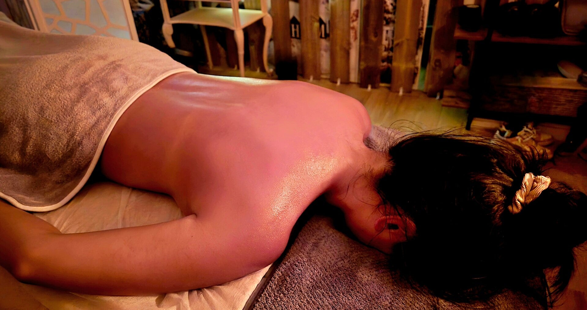 Le buste est massé avec de l'huile afin de permettre de profonds mouvements tout en étant lent et régulier. Le soin se termine par le massage du crâne.